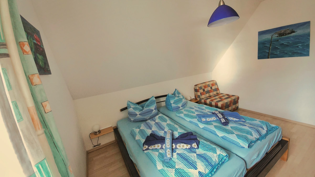 Das Schlafzimmer bietet Ihnen ein Doppelbett und einen ausziehbaren Schlafsessel als Schlafmöglichkeit.