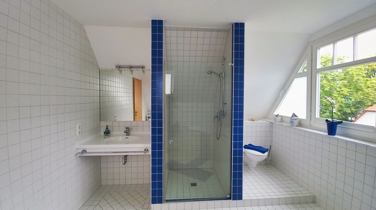 Das elegante und große Bad ist mit Duschkabine, Badewanne, Waschbecken und WC ausgestattet.