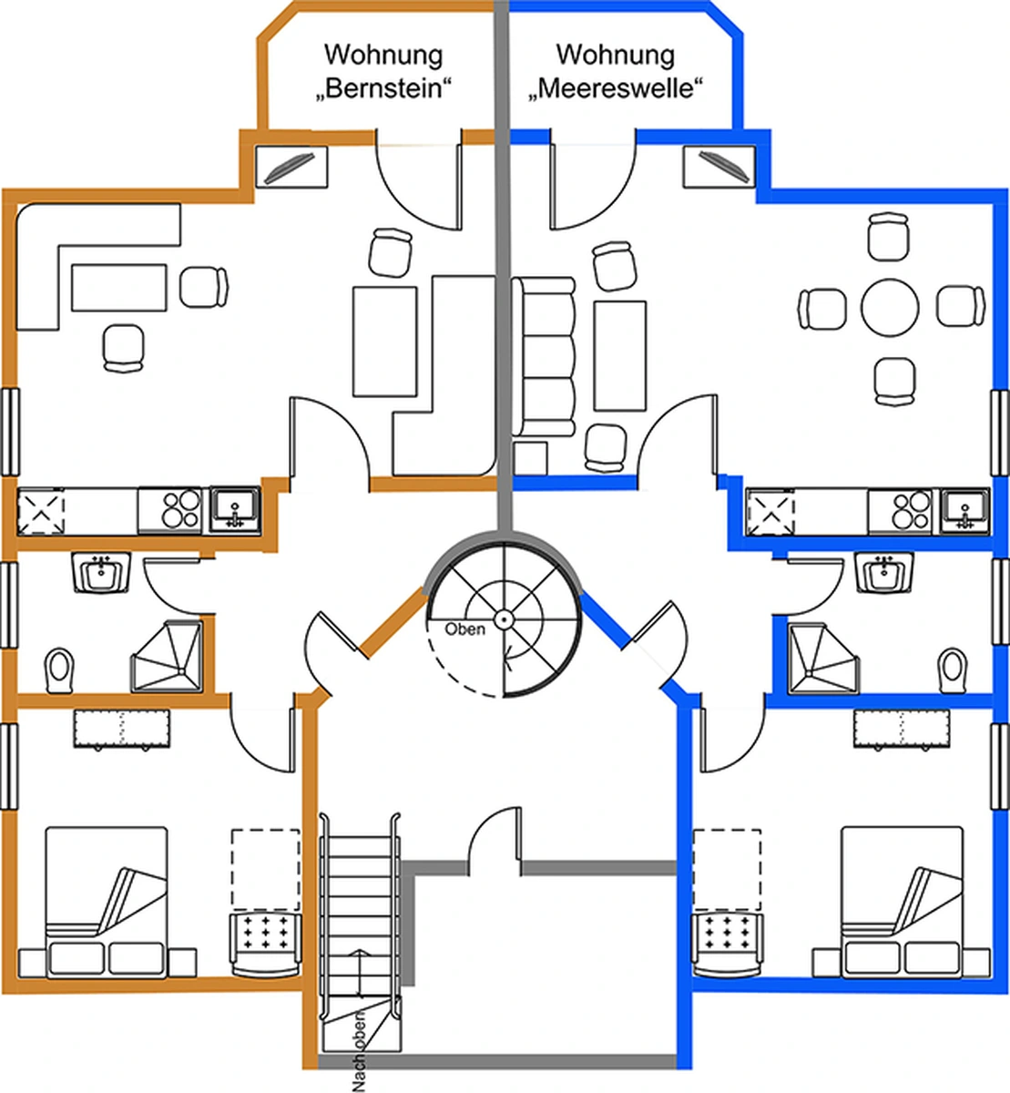 Die Wohnungen befinden sich in der 1. und 2. Etage, sind komfortabel und geschmackvoll eingerichtet mit Balkon in Südlage.
