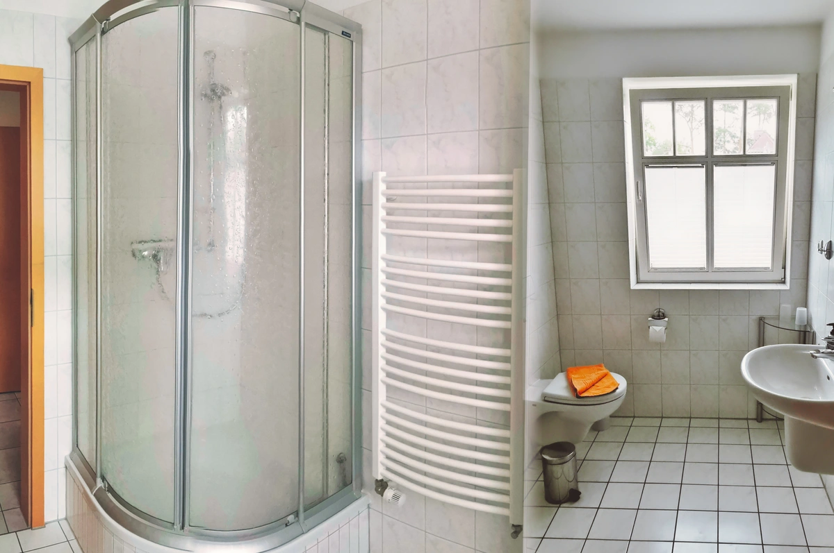 Das elegante und große Bad ist mit Duschkabine, Badewanne, Waschbecken und WC ausgestattet.