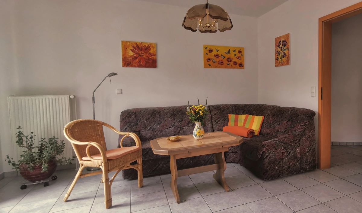 Im geräumigen Wohnzimmer finden Sie eine Sofa- und Essecke vor.