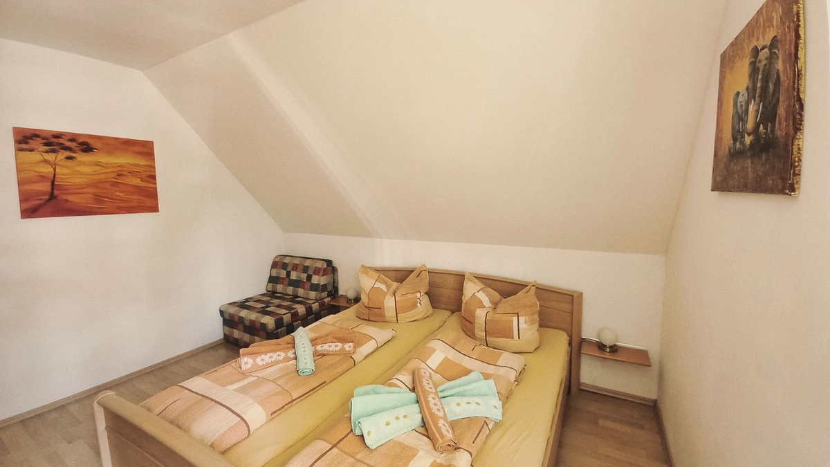 Das Schlafzimmer bietet Ihnen ein Doppelbett und einen ausziehbaren Schlafsessel als Schlafmöglichkeit.